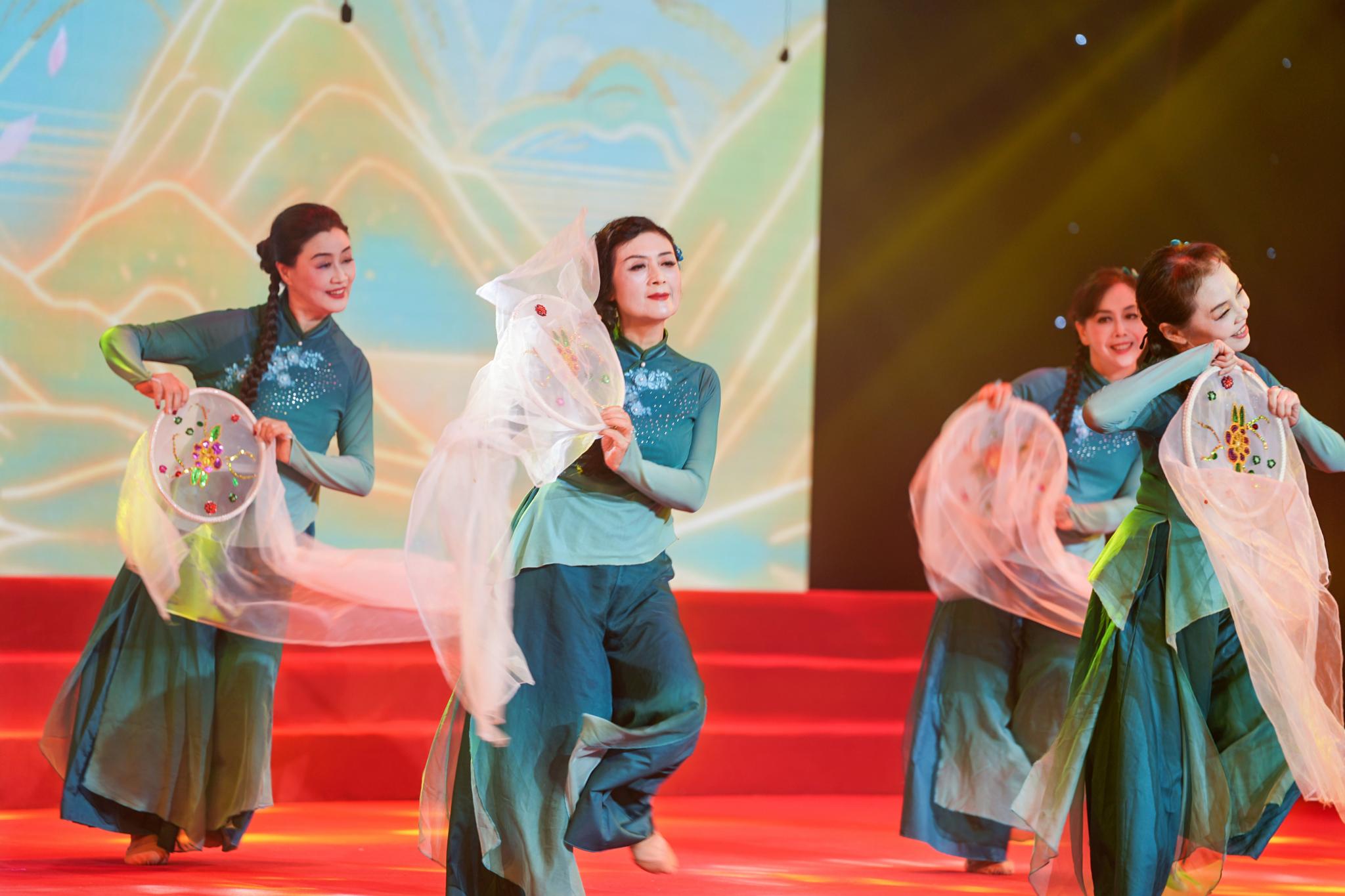 舞蹈《生機勃勃》以靈動的肢體語言展現江南春景,展現了我校離退休教工老有所樂、老有所為、積極向上的銀齡風采以及對錦繡山河的禮贊和對偉大祖國的祝福。