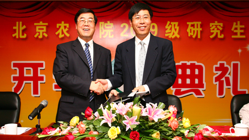 今年的開學典禮與以往有所不同。為了進一步落實市領導提出的北京農學院、北京市農林科學院、北京農業職業學院“三院聯動”服務社會主義新農村建設的指示精神,我校與北京市農林科學院達成了聯合培養研究生、共建博士點的框架協議。在此基礎上,我校首批聘請北京市農林科學院23名研究員為相關學科教授、碩士研究生導師,列入我校研究生招生計劃。