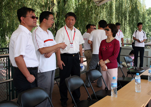 8月13日上午,國慶60周年群眾游行活動第三分指副總指揮王有國、第三分指組織訓練處處長劉文龍看望我校參訓師生,并檢閱了方陣訓練情況。訓練現(xiàn)場,黨委副書記高東就訓練相關問題與王有國、劉文龍進行探討。