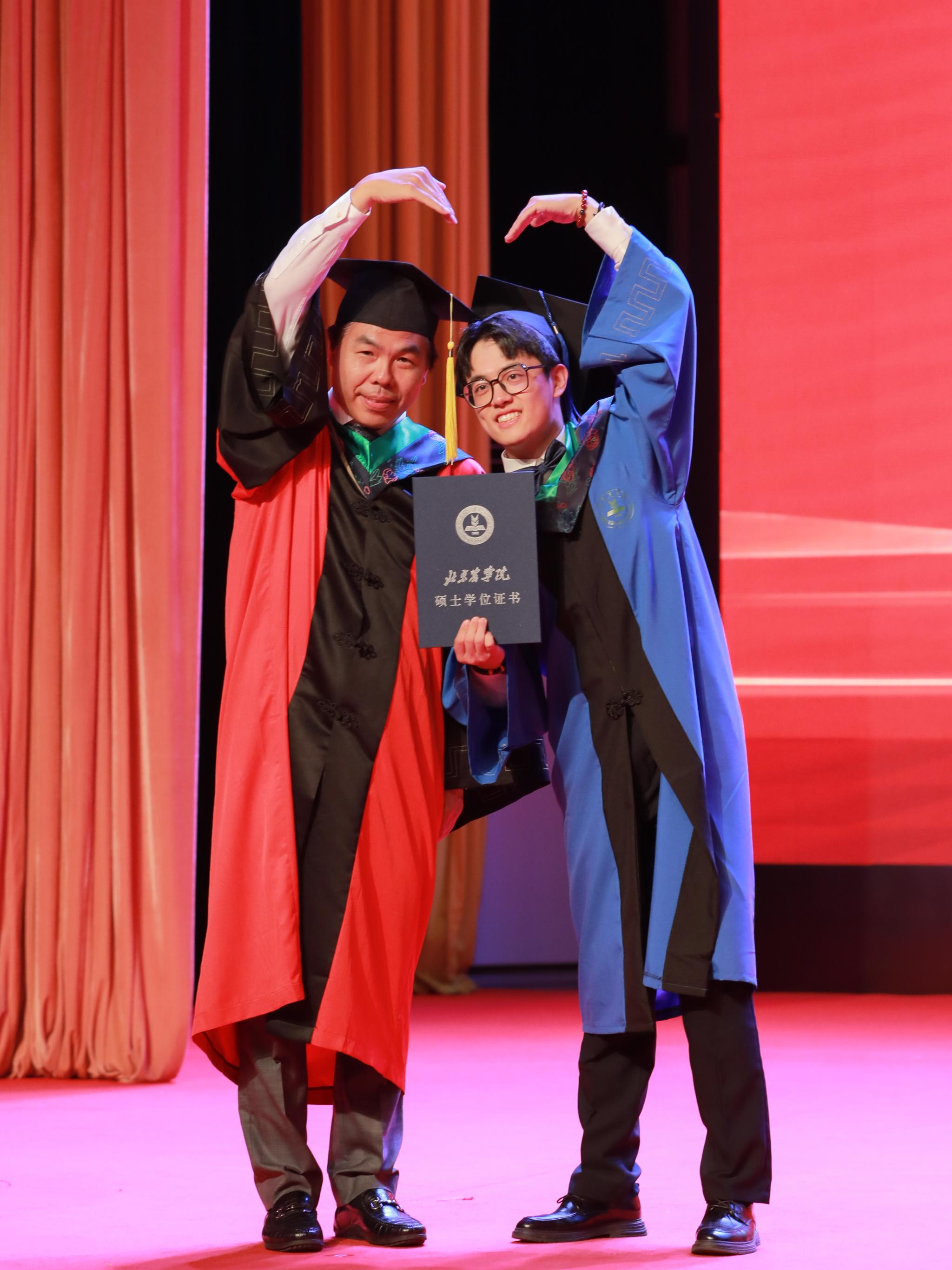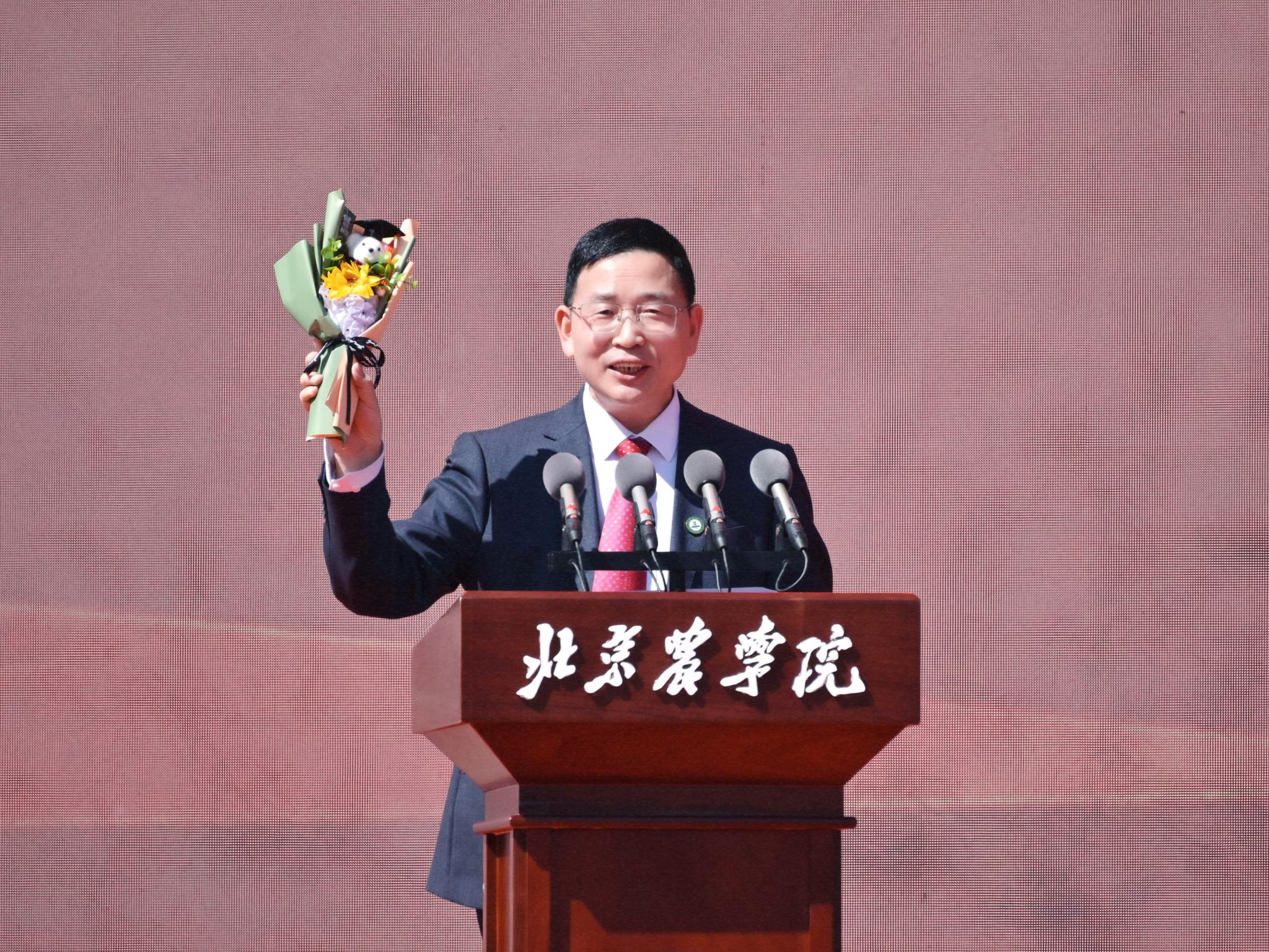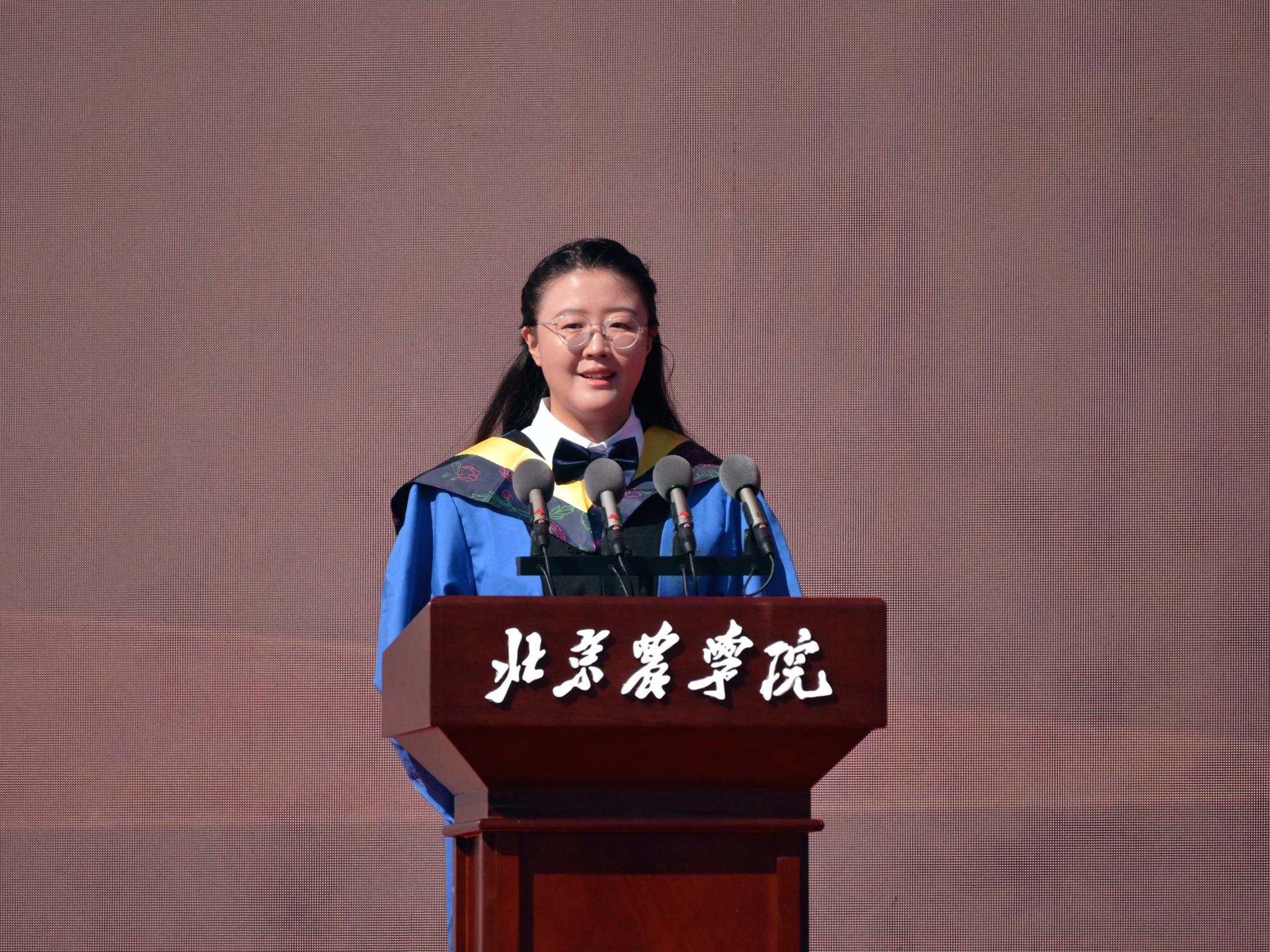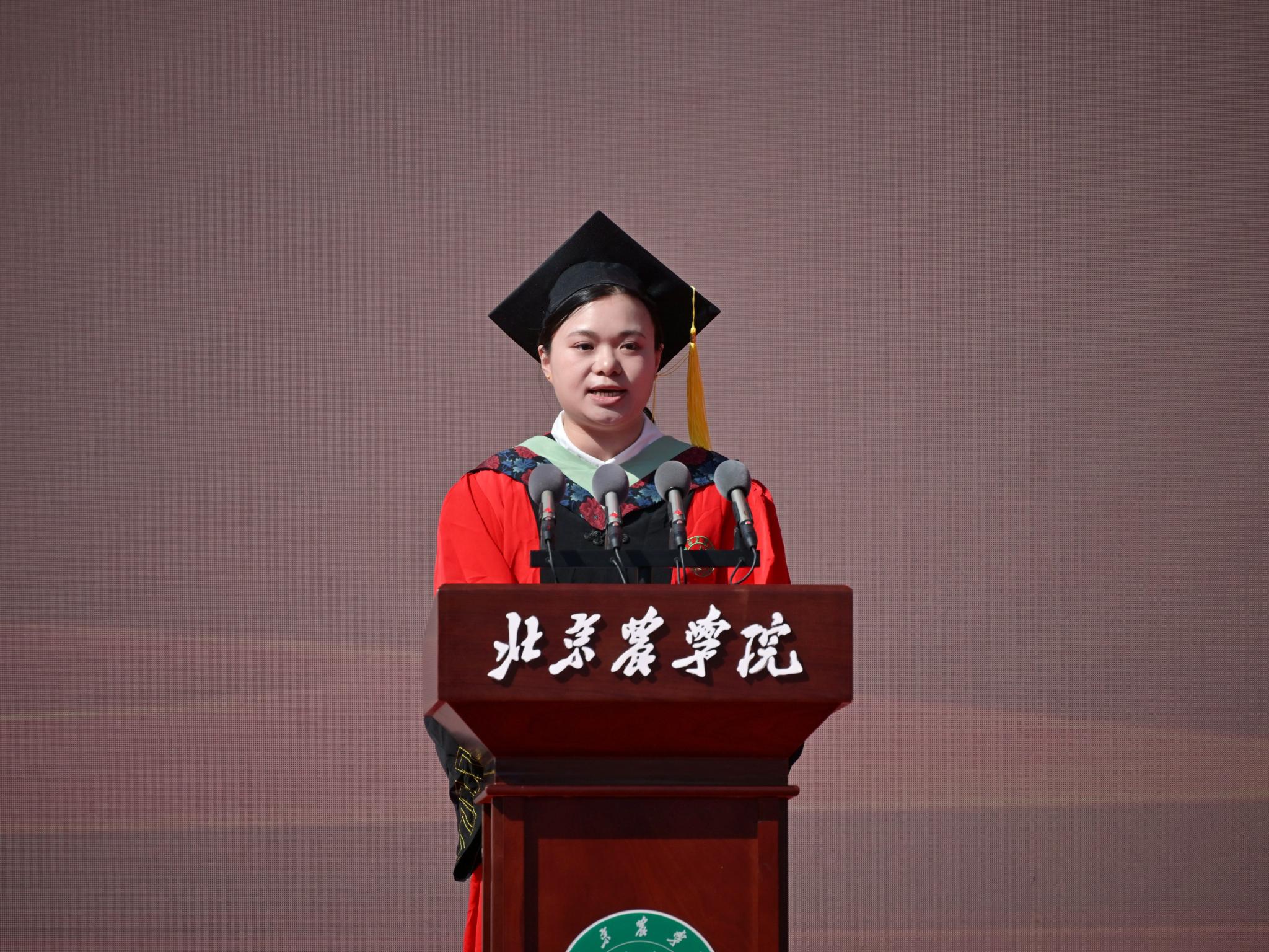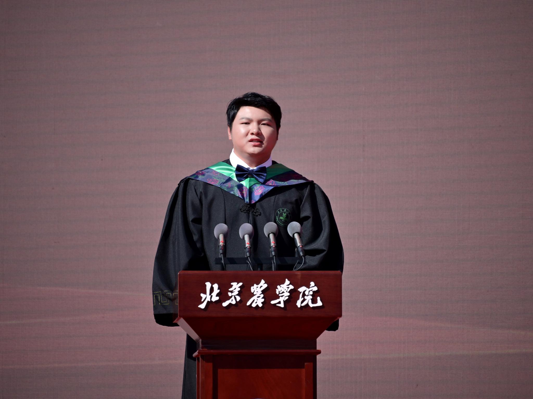 本科畢業生代表、生物與資源環境學院王梓豪同學代表同學們感謝學校四年的精心培養和老師們的悉心教導。他表示,今后將秉持“實干創先”的精神,立志成為一名懂農業、愛農村、愛農民的“新農人”,將論文寫在京華大地上,以實際行動為鄉村振興貢獻青春力量。
