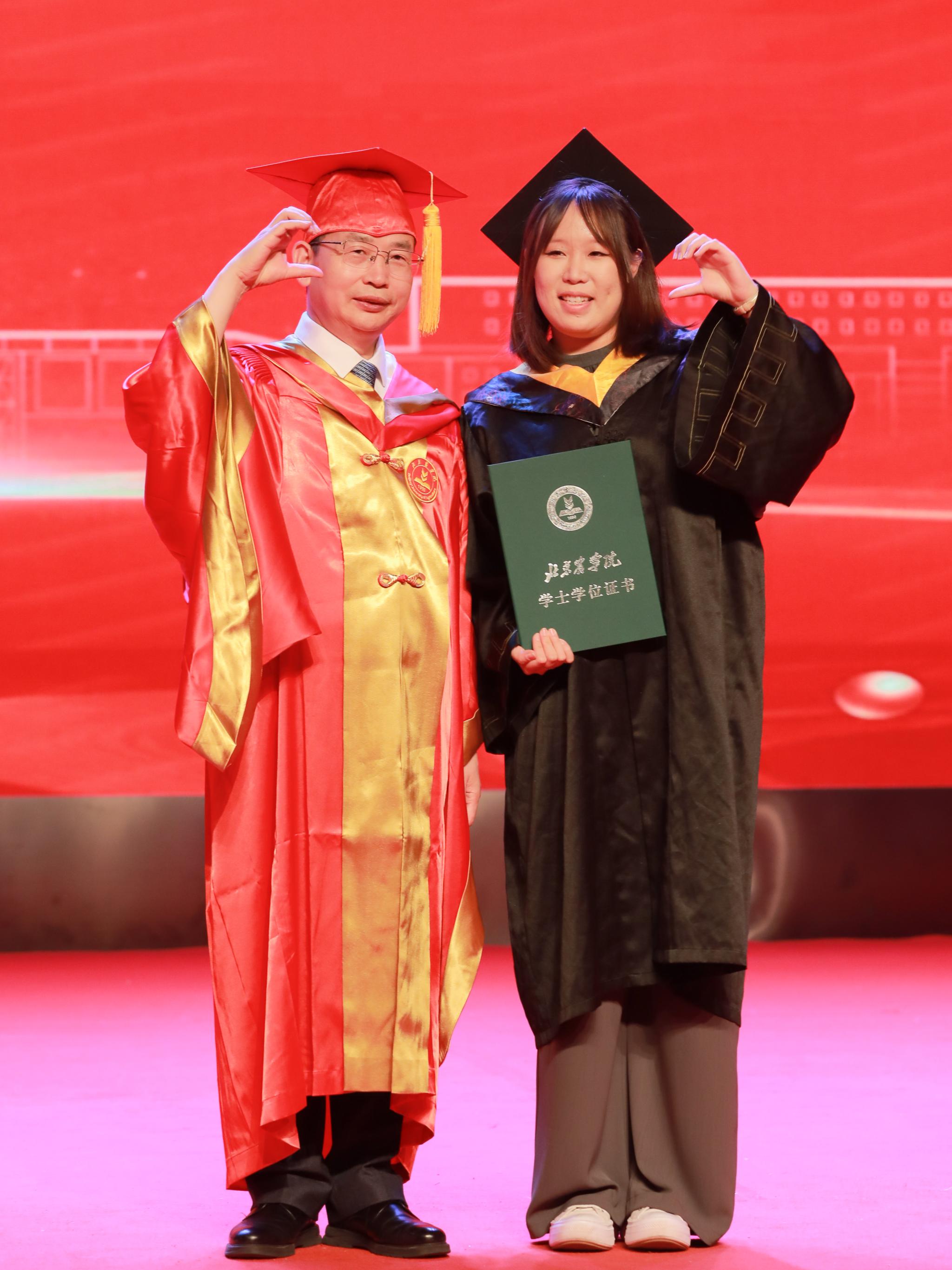 段留生代表學校師生員工為全體畢業生送上殷殷囑托,希望同學們以“厚德”立身,奮進新時代,謹記校訓精神,于平凡中、細微處書寫自己的答卷,乘時代之風、翻后浪之勇,讓青春在“國之大者”中熠熠生輝、綻放光芒;以“篤行”筑基,淬煉新成長,把艱苦環境、艱巨任務作為磨煉自己的機遇,把肯吃苦、敢吃苦、能吃苦當作成就更好人生的選擇,不畏艱辛、篤行實干,在知行合一中蹚出屬于自己的精彩篇章;以“博學”致遠,學習新本領,踐行動態學習、終身學習理念,不斷豐富和更新知識體系,持續精進新技能、鍛造硬本領,勇做時代的“弄潮兒”;以“尚農”為志,展現新作為,牢記“北農人”身份,以“尚農”之心滋養情懷,以“強農”之行踐行擔當,在各自崗位頑強扎根、蓬勃生長,匯聚成強國興農的磅礴力量。