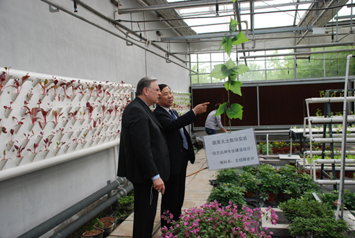 在杜曉林副校長的陪同下,Michel ROUX校長到組培中心參觀。Michel ROUX校長饒有興致地觀看彩色甘薯、草莓脫毒培養,無土栽培設施,百合品種培育等。