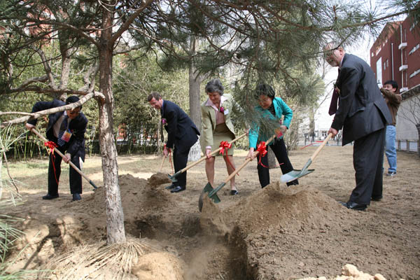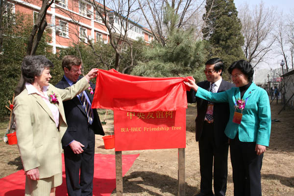 簽字儀式后,與會人員在簽字儀式背景墻上簽字留念。雙方領導在國際學院樓前共同栽下了象征著兩校友誼的中英友誼樹。