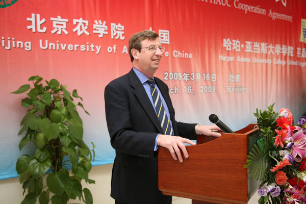 韋恩·瓊斯在致辭中首先向北京農學院近幾年在辦學規模、辦學水平取得的長足進步表示祝賀。他說,五年來兩校在人才培養“3+1”模式、教師之間合作互訪、教學科研合作上取得了顯著成績。今天,雙方續簽合作協議,可以擴大合作領域,為兩校的未來發展提供更好的前景和出路。他真誠地邀請校長王有年9月赴英出席合作項目學生的畢業典禮,并向王有年校長正式遞交了邀請函。