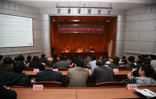 ,我校在報告廳召開2009年寒假中層干部會。全面總結我校2008年工作, 對2009年的工作進行全面部署。黨委書記王慧敏做了重要講話。院長王有年做了題為《學習實踐科學發展觀,開創學校工作新局面》的工作報告。黨委副書記羅維忠主持會議。校領導和全體中層干部出席會議。
