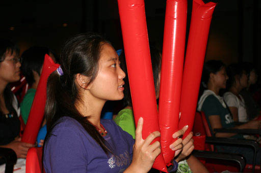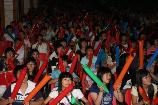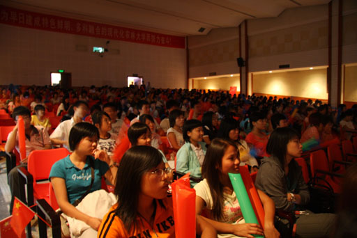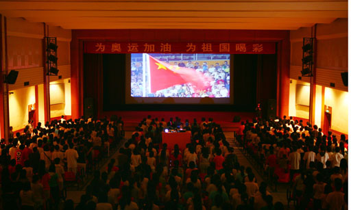 還未到7點鐘,同學們已陸續(xù)進入禮堂,一同等待為這個激動的時刻加油喝彩!當大屏幕上出現(xiàn)鳥巢的外景時,同學們歡呼雀躍,雖然沒能在鳥巢現(xiàn)場觀看,但興奮激動的心情毫不遜色于身臨其境的感受。同學們一陣陣敲擊手中的充氣棒,全場的氣氛隨著開幕式的分秒臨近而逐漸升溫。