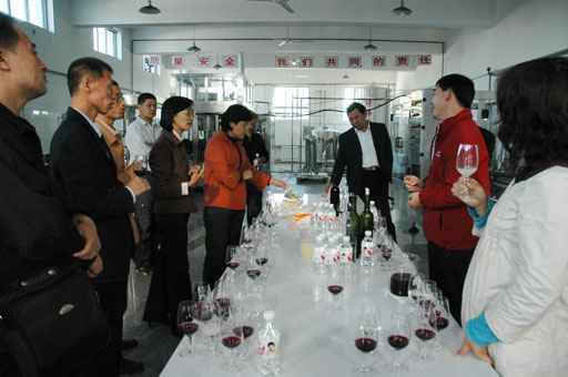 王書記一行深入葡萄田間,了解葡萄生長與病蟲害狀況以及品種情況。在現場技術人員的陪同講解下,王慧敏書記、杜曉林副院長來到釀造車間,觀察葡萄的除梗、破碎、入罐,酵母添加以及發酵后果渣的壓榨等工藝后,品嘗了紅葉莊園釀造的成品葡萄酒以及正在發酵的本年份葡萄酒,領導們對莊園掌握從田間地頭到裝瓶成品全過程的質量與安全控制,完全采用自己種植的葡萄釀造葡萄酒,從原料到成品全過程公開、透明這種集葡萄種植與釀造一體的生產模式給予高度評價。