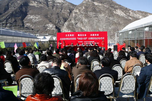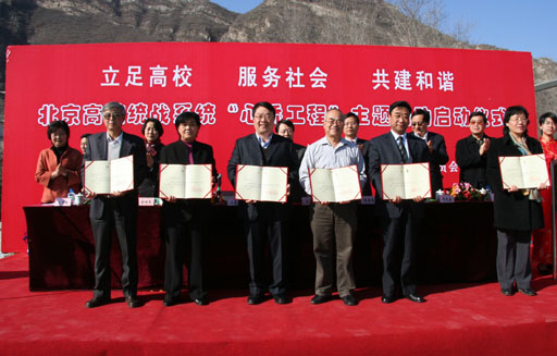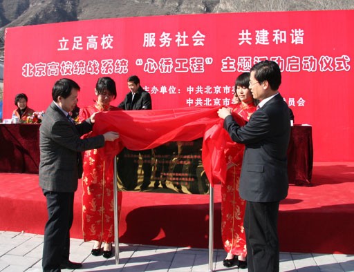 3月6日下午,由中共北京市委統戰部、北京市委教育工作委員會主辦,我校承辦的以“立足高校、服務社會、共建和諧”為主題的“心橋工程”啟動儀式在我校服務北京新農村建設基地門頭溝區龍泉生態園舉行。中央統戰部副部長陳喜慶,中央統戰部六局副巡視員張明杰,北京市委統戰部副部長楚國清,門頭溝區委副書記郭光磊,我校黨委書記王慧敏、院長王有年出席啟動儀式并在出席臺上就座。中央統戰部、市委統戰部、門頭溝區委相關處室的領導,以及各高校主管統戰工作的黨委書記、統戰部長100余人參加了啟動儀式。儀式由市委教育工委副書記王民忠主持。