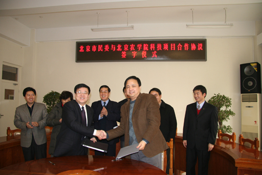 12月28日,北京農(nóng)學(xué)院鄭一淳副院長代表學(xué)校與北京市民委馬中璞副主任在B209教室共同簽署了科技合作項目協(xié)議書。北京農(nóng)學(xué)院王有年院長和北京市教委專職委員孫善學(xué)等出席了簽字儀式。協(xié)議的簽署表明北京農(nóng)學(xué)院與北京市民委的合作進入正式實施階段,北京農(nóng)學(xué)院將作為北京市民委的技術(shù)依托單位參與北京少數(shù)民族鄉(xiāng)村建設(shè)社會主義新農(nóng)村的進程。