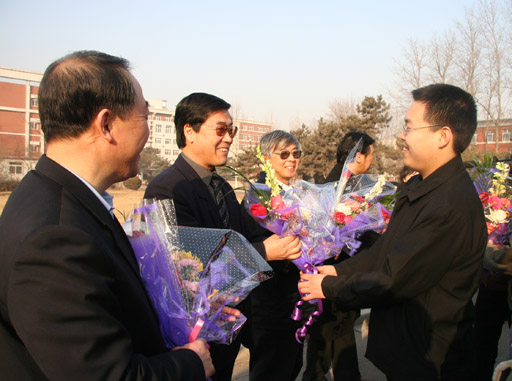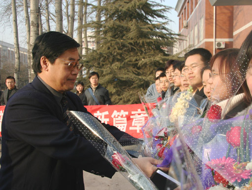 3月7日,初春的太陽,用明亮映襯著喜氣洋洋的校園。辦公樓前,即將上任的15名“村官”助理手捧植科系、食品系學生贈送的鮮花,食品系的學生展著“上北農,學科技,譜寫都市農業新篇章;下基層,做村官,建設社會主義新農村?!睔g送條幅。