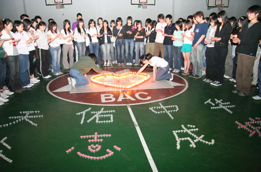 活動中,同學們用蠟燭擺出“心”型圖案和“天佑中華,眾志成城”的字樣,心形圖案的中間加有“5.12”,以此悼念遇難群眾;為被困者、救援人員祈求平安;并呼喚大學生學會感恩,學會以己之能回報社會。