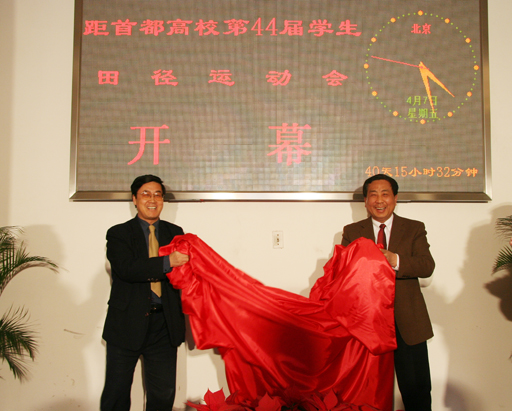 院長王有年揭牌儀式上表示,將堅持“綠色奧運,科技奧運,人文奧運”的三大理念,以體現首都大學生的精神風貌為主體內容,舉全校之力辦好首都高等院校第44屆學生田徑運動會,向我校50華誕獻禮,迎盼2008年奧運會。