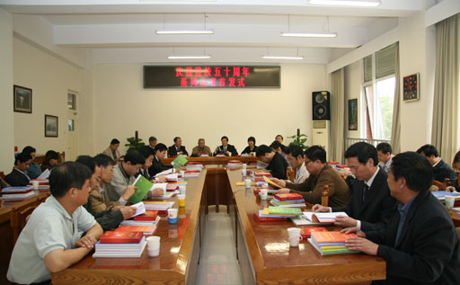 經過我校校慶籌委會成員近一年時間的精心準備,凝聚了幾代人心血的我校五十周年校慶叢書——《閃光的足跡》、《回首憶往事》、《教授風采錄》、《五十年歷程》和校慶專題片《耕耘》、校慶畫冊《五秩耕耘》面世。10月13日下午,系列叢書首發儀式在教學樓會議室舉行。