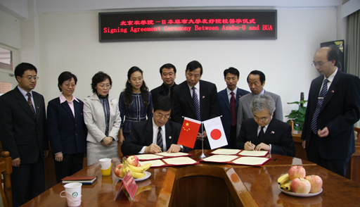 院長王有年和麻布校長政網俊夫互贈了禮品。日本麻布大學校長政網俊夫、國際交流協會會長菅沼常德、環境保健學部長其木茂則,以及學校相關人員出席了簽字儀式。