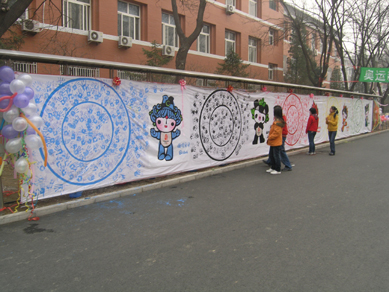 3月22日中午,校團委宣傳櫥窗前人群涌動,五彩氣球將櫥窗和道路兩旁裝點得格外美麗。櫥窗前長 ,寬 的畫布上,藍、黑、紅、黃、綠五環和奧運吉祥物貝貝、京京、歡歡、迎迎、妮妮依次相間排列,同學們紛紛在五環幕布上印下自己手印,表達對奧運會成功舉辦的企盼與祝愿。這是我校學生會在慶祝奧運會倒計時500天之際舉辦的“手印五環,志愿奧運”活動。