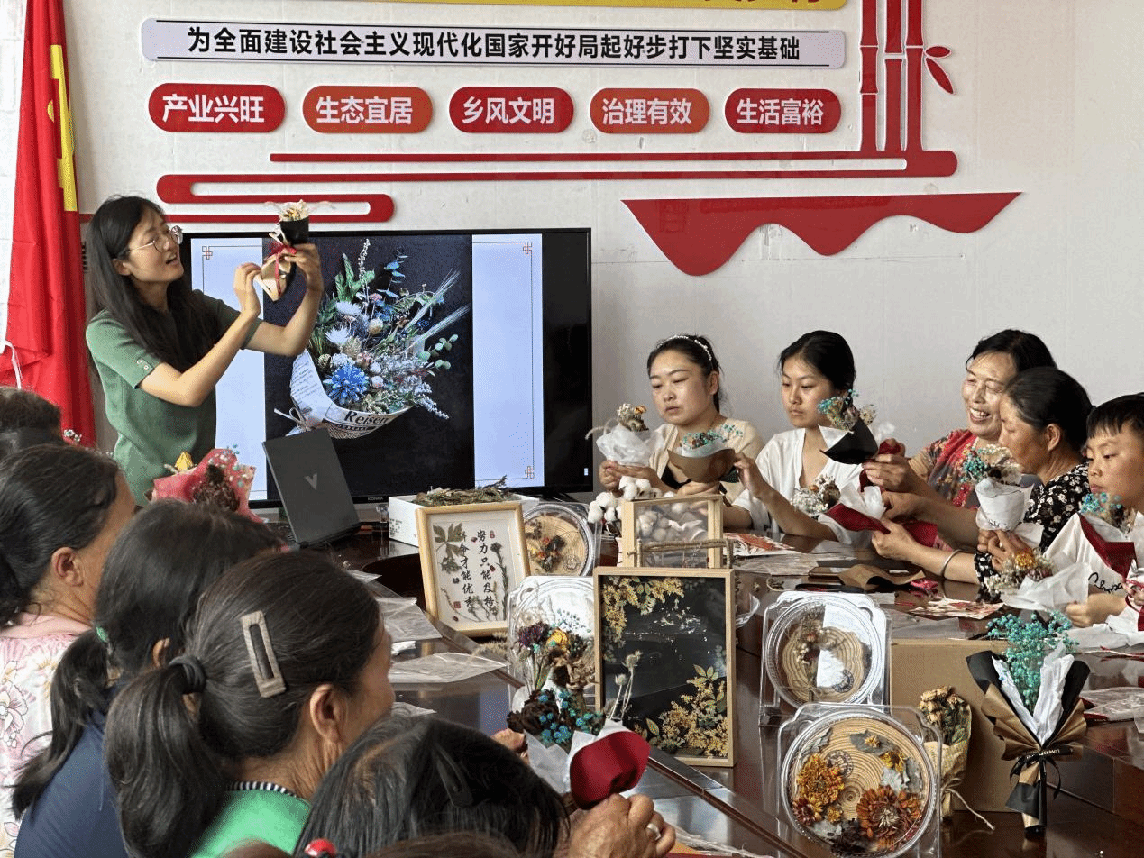 他們將目光聚焦于嵐縣的鄉村旅游和一年一度的“土豆花開”文化節活動,深入挖掘王家村的文旅資源,打造特色文旅產品。而“賣土豆花”這一創意舉措,正是他們智慧的結晶。針對中小學生開展了“寓教于樂”的特色研學活動,集“科學性、藝術性、實踐性”于一體,以土豆花及嵐縣王家村鄉土植物為素材制作特色干花文創作品,在親手制作壓花作品的藝術體驗當中,了解鄉村特色植物文化及科學知識,為學生們上了一堂生動的“知農、愛農、學農”暑期實踐課。針對王家村村民,從干花植物材料選擇、花材采集、處理、制作,以及不同形式干花產品創作等方面進行了系統的技術培訓,使參加培訓的村民們掌握了干花產品研發的相關技術,研創出深受游客喜愛的干花作品,并結合當地文旅實現了新形式的創收。同時,CCTV-17對我校師生發揮學科專業優勢,以“土豆花”創新模式助力鄉村振興的做法進行直播報道。