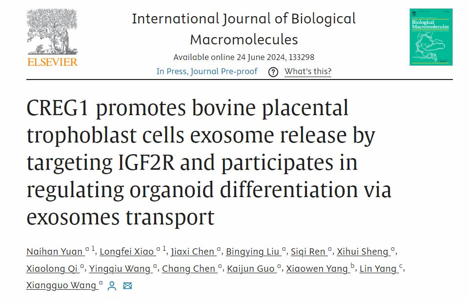 近日,北京農學院動物科學技術學院王相國副教授課題組在《國際生物大分子雜志》(International Journal of Biological Macromolecules)上在線發表了題為《CREG1靶向結合IGF2R促進牛胎盤滋養層細胞外泌體的形成與釋放并伴隨外泌體運輸參與胎盤類器官的分化調節》(CREG1 promotes bovine placental trophoblast cells exosome release by targeting IGF2R and participates in regulating organoid differentiation via exosomes transport)的研究論文。