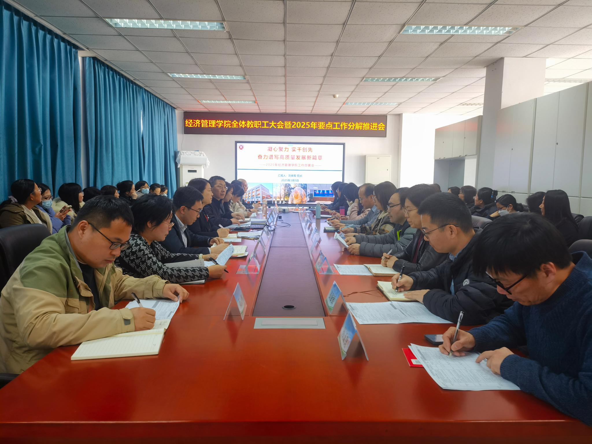 3月5日,經(jīng)濟(jì)管理學(xué)院召開全體教職工大會暨2025年要點(diǎn)工作分解推進(jìn)會,傳達(dá)學(xué)習(xí)學(xué)校2025年工作部署會精神,分解推進(jìn)新一年重點(diǎn)工作。學(xué)院全體教職工參加會議,會議由學(xué)院黨委書記劉芳主持。