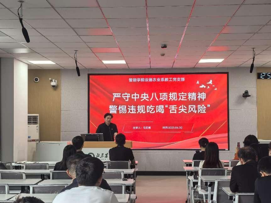 智能學院設施農業系教工黨支部書記馬前磊以警惕違規吃喝“舌尖風險”為主題開展黨課。他緊密聯系教師的教育工作以及學生的日常行為,通過生動詳實的案例,為黨員們敲響了廉潔自律的警鐘,引導大家在教育一線和日常生活中自覺抵制不良風氣,樹立清正廉潔的良好形象,切實履行好教書育人、為人師表的職責使命。