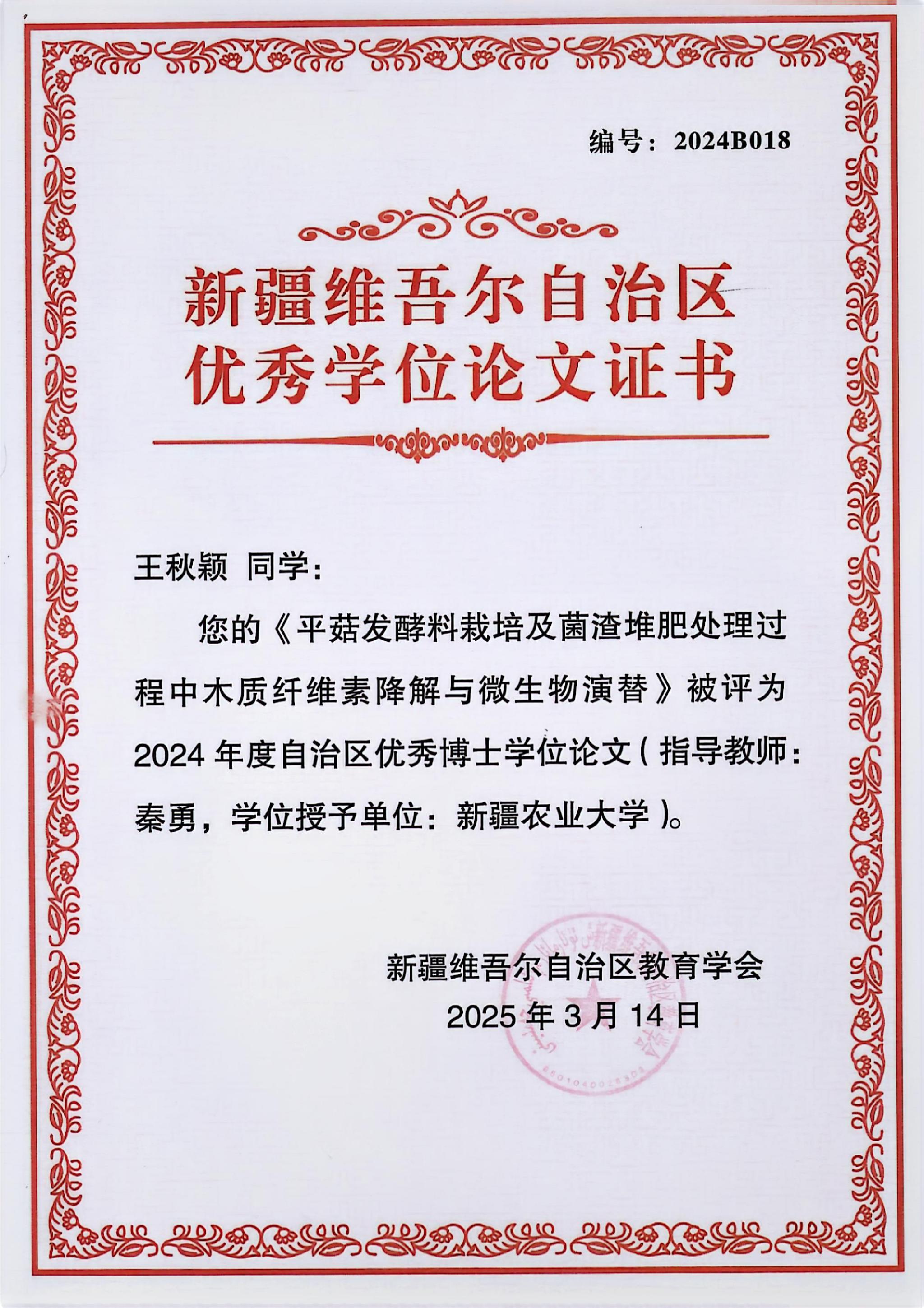 近日,新疆維吾爾自治區教育廳公布2024年優秀學位論文評選結果,北京農學院植物科學技術學院2024屆聯合培養博士王秋穎的學位論文《平菇發酵料栽培及菌渣堆肥過程中木質纖維素降解與微生物群落演替》成功入選。該論文由北京農學院張國慶教授與新疆農業大學秦勇教授聯合指導完成。