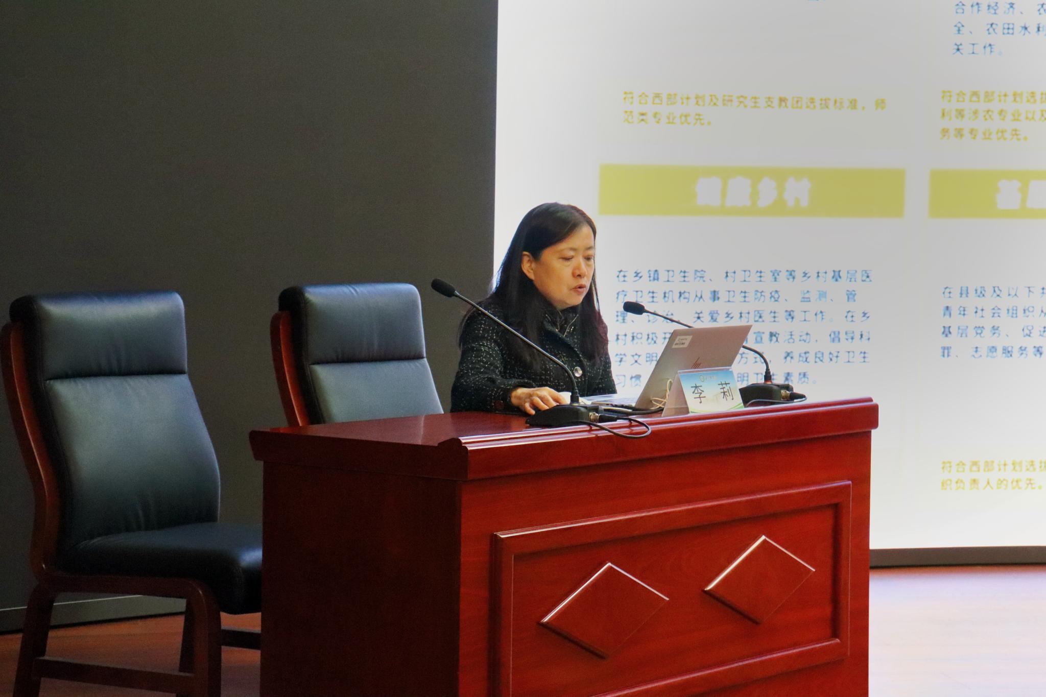 李莉詳細解讀了2025年西部計劃的招募政策,對項目背景、政策保障、服務項目和招募安排等方面展開了介紹和指導,與會學生認真聆聽,并就服務期滿后的考核制度及相關政策保障、職業發展等具體問題踴躍提問。李莉耐心解答了同學們提出的問題,并就報名要求、服務專項專業限制以及相關注意事項進行了進一步說明和強調。