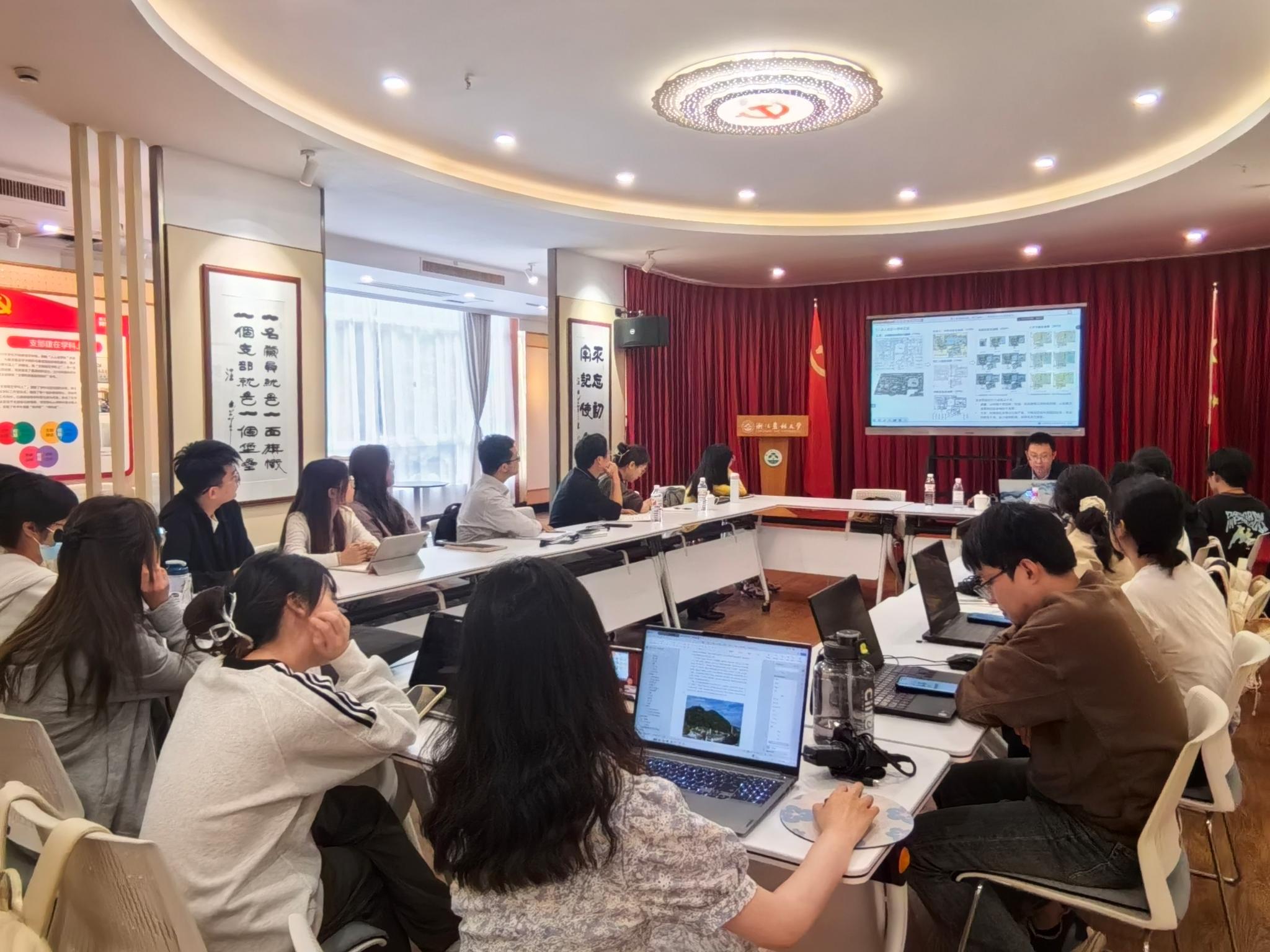 我校園林學院風景園林系副主任朱強代表科研團隊“三山五園工作室”匯報了在清代皇家園林歷史研究、設計實踐與科普宣傳上的系列成果。各專業負責人與浙江農林大學相關專業教師就當前行業發展形勢下的人才培養思路交換了意見,探討了修訂新版培養方案的主要思路,并圍繞《設計初步》《園林制圖》《園林設計》《園林工程》《綠地系統規劃》等多門專業課程的架構設置、授課方法、學生反饋等內容進行深入探討。