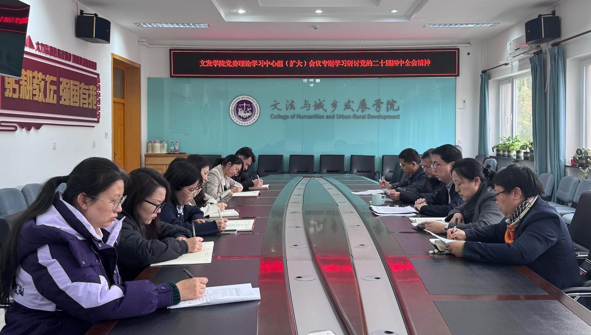10月29日,文法與城鄉(xiāng)發(fā)展學(xué)院召開(kāi)黨委理論學(xué)習(xí)中心組(擴(kuò)大)會(huì)議,專題學(xué)習(xí)研討黨的二十屆四中全會(huì)精神。會(huì)議由文發(fā)學(xué)院黨委書(shū)記趙和文主持。