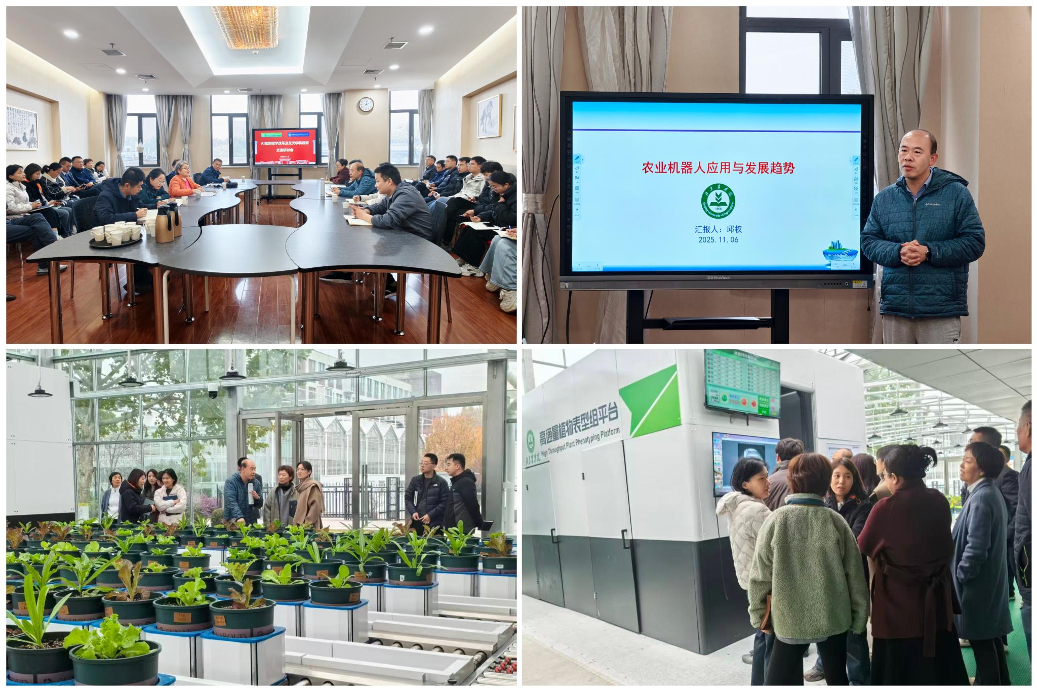 智能科學與工程學院副院長(主持工作)邱權介紹了農業機器人科研工作進展情況。參會人員圍繞AI賦能教學改革、交叉學科建設、科研工作需求等內容進行了交流研討。實地調研學校高通量植物表型組平臺,并對平臺建設進行溝通交流。本次學習交流活動為植科學院和智能學院開展教學科研合作搭建了平臺,為推進AI賦能教學改革及交叉學科建設奠定了基礎。