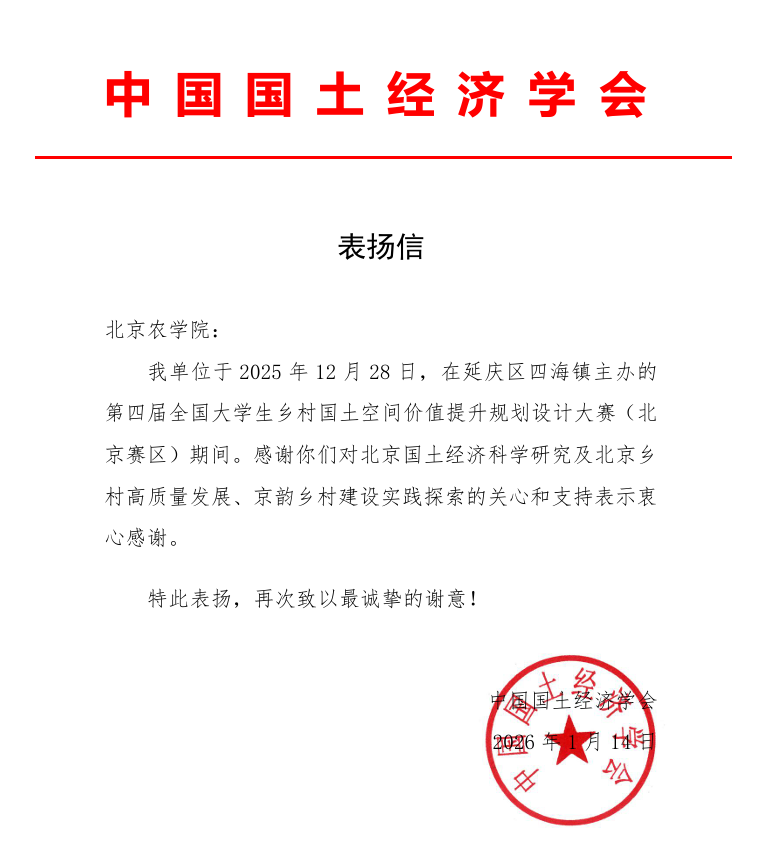 近日,中國國土經濟學會致信北京農學院,對學校生物與資源環境學院承辦第四屆全國大學生鄉村國土空間價值提升規劃設計大賽北京賽區啟動及調研會的工作予以通報表揚。