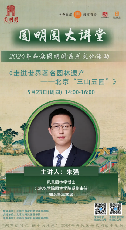 活動內容:位于北京海淀的“三山五園”是世界聞名的文化遺產,是令人嘆為觀止的園林藝術杰作。本期講座邀請北京農學院風景園林系副主任、知名青年學者朱強老師講解“三山五園”的歷史發展和藝術特點,闡述文化遺產保護的重要意義,激發聽眾對傳統文化的熱情與愛國情懷。