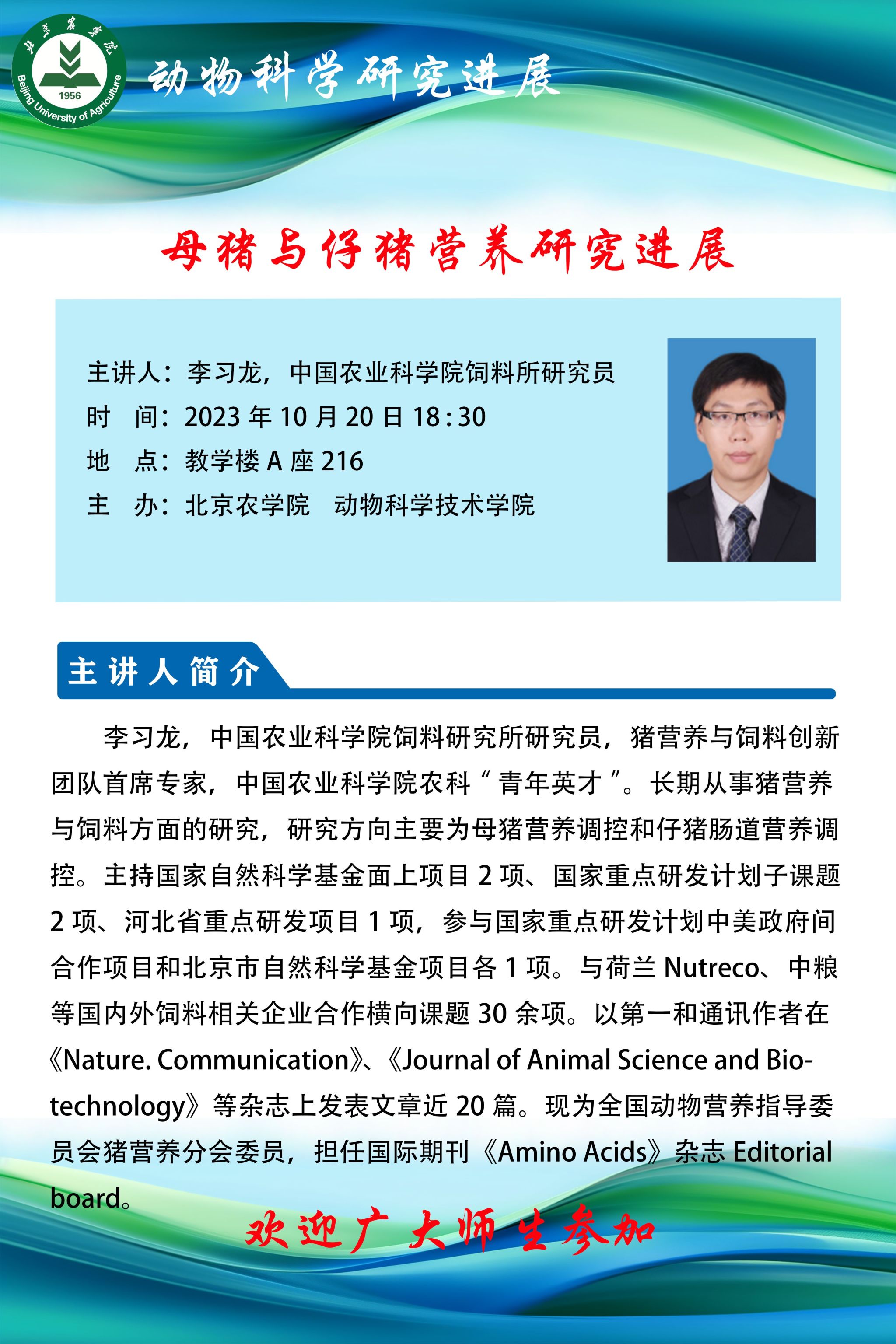 李習龍,中國農業科學院飼料研究所研究員,團隊首席科學家,中國農業科學院農科英才“青年英才”。長期從事豬營養與飼料方面的研究,研究方向主要為母豬營養調控和仔豬腸道營養調控。母豬營養調控重點研究母體營養對胎兒存活率的影響及其作用機制;仔豬腸道營養調控重點研究活性物質調控斷奶仔豬腸道健康的作用及其機制。主持國家自然科學基金面上項目2項、國家重點研發計劃子課題2項、河北省重點研發項目1項,參與國家重點研發計劃中美政府間合作項目和北京市自然科學基金項目各1項。與荷蘭Nutreco、中糧等國內外飼料相關企業合作橫向課題30余項。以第一和通訊作者在Nat. Commun.、J. Anim. Sci. Biotechnol.等雜志上發表文章近20篇。現為全國動物營養指導委員會豬營養分會委員,擔任國際期刊Amino Acids雜志Editorial board。