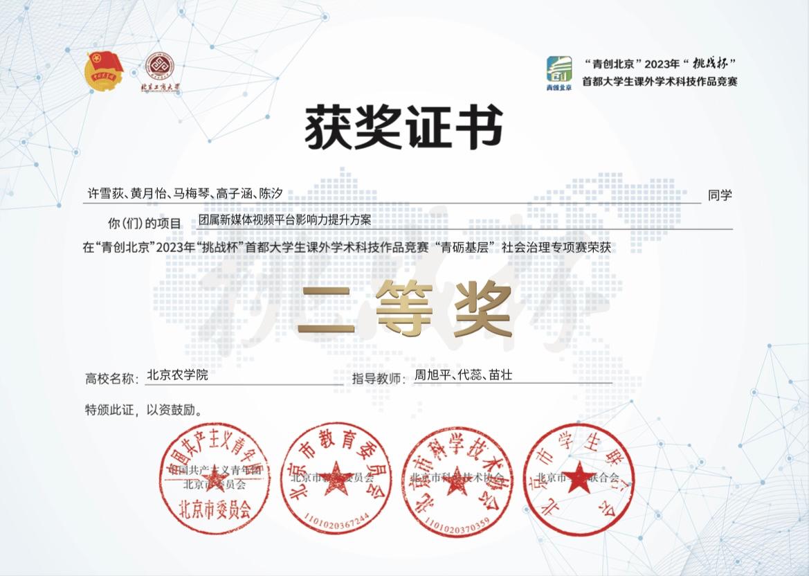 讓她印象深刻的是關于“團屬新媒體視頻平臺影響力提升方案”的“挑戰杯”項目參賽歷程。項目推進中的最大困難是數據爬取,《青春北京》抖音號發布的視頻量較大,經過多方面考量,團隊決定用軟件對最近一個月的視頻點贊量和轉發量進行爬取并分析視頻熱度,團隊面臨著技術與時間的雙重壓力?!岸嗵澚藢W院老師的指導與幫助,項目才得以繼續推進?!痹陧椖恐笇Ю蠋煹墓膭钕?,黃月怡與團隊成員一起查閱相關資料,學習使用相關軟件,在新領域逐步探索,最終獲得比賽二等獎。面對挑戰,她從不輕言放棄,而是沉心靜氣,在解決問題的實戰中淬煉能力,“我始終堅信,人生當勇于向前,步履不停?!?/p>