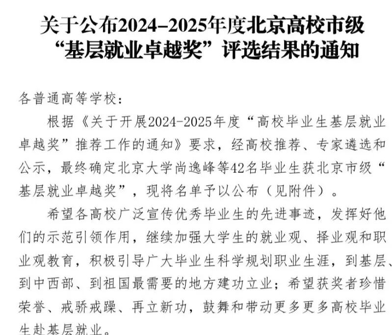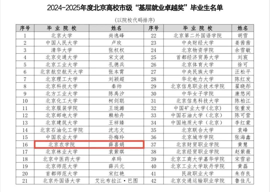 近日,北京市教育委員會(huì)公布了2024-2025年度北京高校市級(jí)“基層就業(yè)卓越獎(jiǎng)”評(píng)選結(jié)果,我校扎根西藏自治區(qū)雪域高原、投身基層事業(yè)的2017屆畢業(yè)生薛喜娟榮獲北京市級(jí)“基層就業(yè)卓越獎(jiǎng)”。