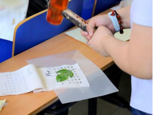參與者此起彼伏的錘聲在空間中響起,奇妙的“魔法”便發(fā)生了:葉綠素變作翡翠色鑲進載體;花青素在布面暈開,留下花的訴語。同學們有的沉浸在敲拓的節(jié)奏中,有的醉心于色彩的調配里,當一個個作品誕生,是人與自然美學的相遇。
