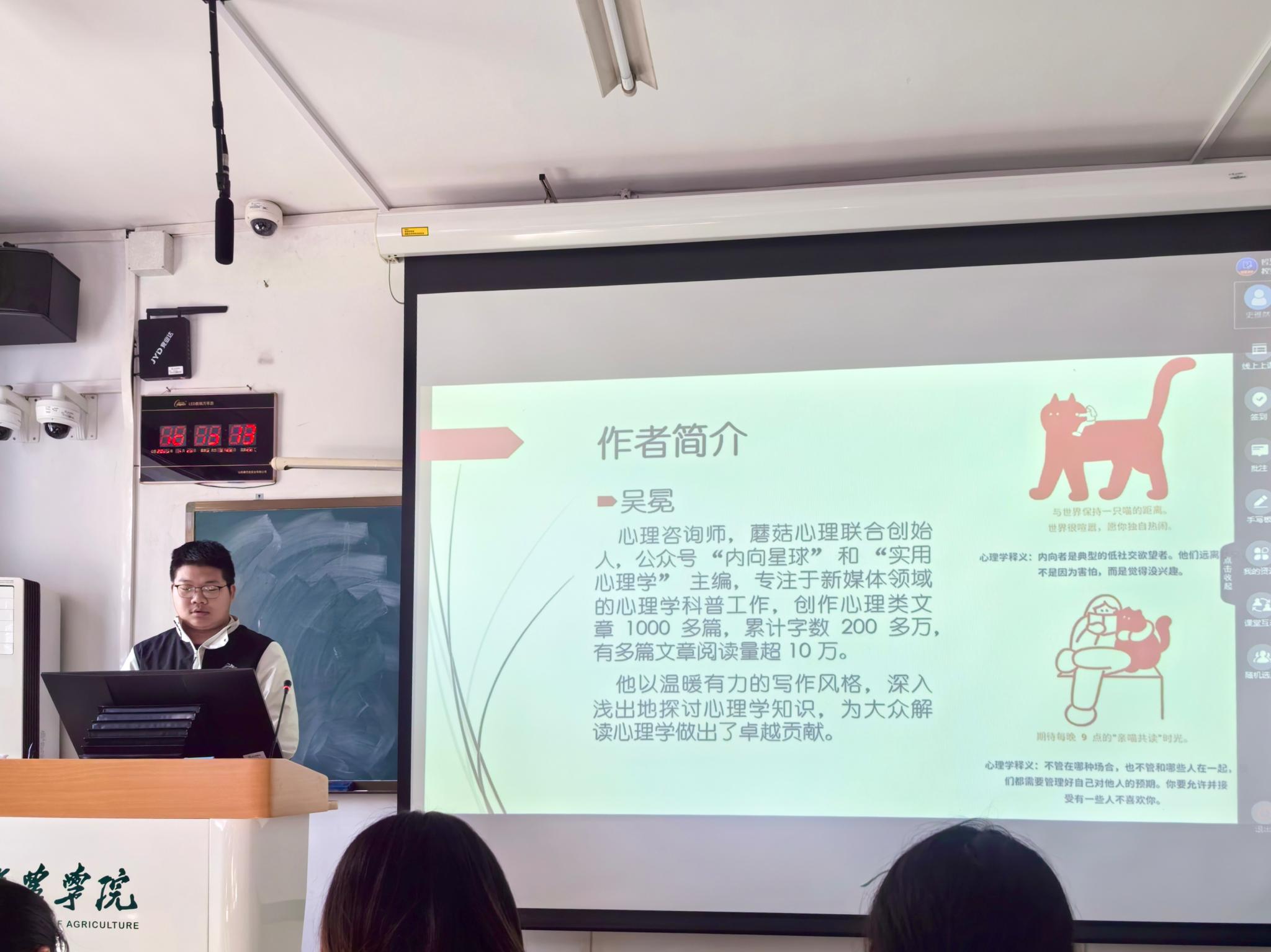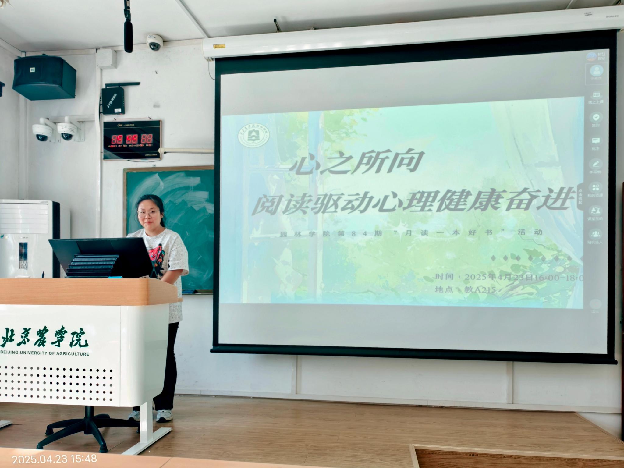 2025年4月23日世界讀書日,園林學(xué)院第84期“月讀一本好書”活動在教A215順利舉行,本期的主題是“心之所向,閱讀驅(qū)動心理健康奮進”。閱讀是一場心靈之旅,為心理健康注入溫暖與力量,照亮內(nèi)心深處。它助我們撥開迷霧,清晰認識自我,在成長路上穩(wěn)步前行;它架起溝通橋梁,改善人際關(guān)系,讓愛與溫暖流淌;它治愈心靈疲憊,提升幸福感,讓生活充滿詩意;它守護心理健康,預(yù)防疾病,讓我們在紛繁世界中保持寧靜與堅韌。本次活動由園林學(xué)院研究生會學(xué)術(shù)部成員安嘉樂主持,園林學(xué)院2024級研究生參與,共同領(lǐng)略讀書的樂趣。