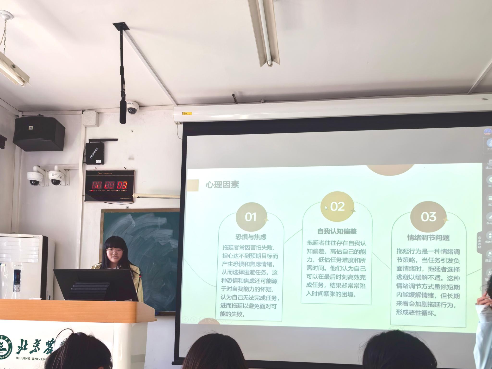拖延并非簡單的“懶惰”,而是一種源于內(nèi)心的恐懼與焦慮。王文靖同學(xué)通過分享《拖延心理學(xué)》中豐富的案例和實用的心理學(xué)技巧,鼓勵大家正視拖延,找到適合自己的解決方案,從而更好地管理時間,提升生活與學(xué)習(xí)的效率。
