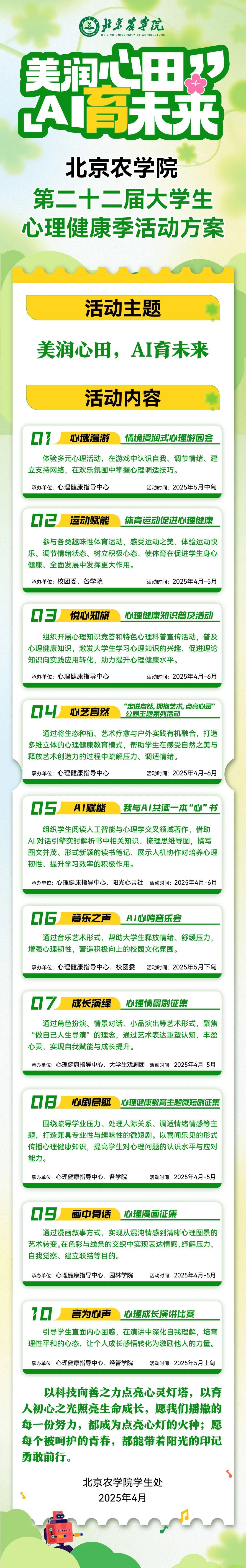 一圖讀懂|北京農學院“美潤心田 AI育未來”第二十二屆大學生心理健康季活動方案