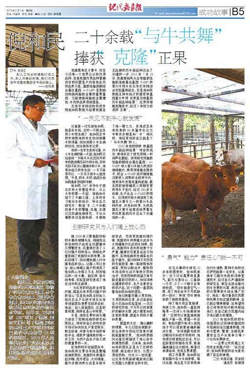 倪和民1987年畢業(yè)于西北農(nóng)林大學(xué)獸醫(yī)專(zhuān)業(yè),從上大學(xué)的那一天起,他就和牛結(jié)下了不解之緣。上學(xué)時(shí)學(xué)習(xí)有關(guān)牛的知識(shí),畢業(yè)后又研究牛、“制造”牛,二十余載投身于牛的繁殖、生殖、生理以及防御疾病研究,不論從事教學(xué)還是做科研,牛都助了他一臂之力,在他近五年來(lái)發(fā)表的60余篇專(zhuān)業(yè)論文中有許多都是和“牛”相關(guān)的,他經(jīng)常戲稱(chēng)自己就是個(gè)“與牛共舞”的人。