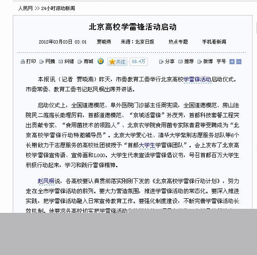 趙鳳桐說,各高校要認真貫徹落實剛剛下發的《北京高校學雷鋒行動計劃》,努力走在全市學雷鋒活動的前列。要大力營造氛圍,推進學雷鋒活動的常態化。要深入推進實踐,把學雷鋒活動融入日常宣傳教育工作。要強化制度建設,不斷完善學雷鋒活動長效機制。他要求各高校切實把學雷鋒活動作為學校的一項重點工作,在繼承的基礎上,發揚創新精神,不斷賦予學雷鋒活動以新的時代內涵、新的形式和新的吸引力。