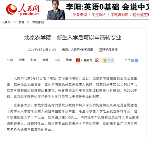 人民網北京5月13日電(熊旭 實習生邱瑞昕)近日,北京農學院招生就業辦公室主任、教務處處長張喜春、國際學院院長張志勇做客人民網,網友們分享交流了2014年北京農學院的招生政策和注意事項。張喜春談及今年招生制度的新變化時提到,從2014年起,北京農學院開始實行新生入學以后可以申請轉專業的制度。