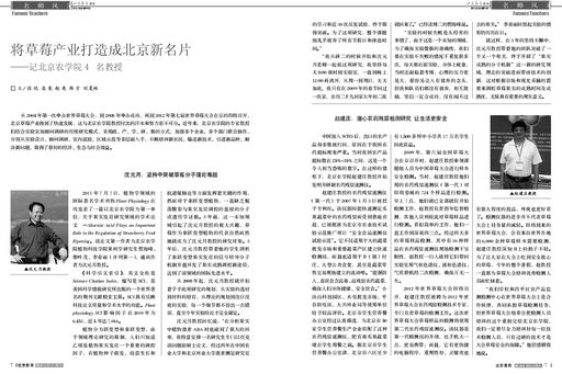 從2004 年第一次申辦世界草莓大會,到2008 年申辦成功,再到2012 年第七屆世界草莓大會在京的即將召開,北京草莓產業得到了快速發展,這與北京農學院教授付出的汗水和努力密不可分。近年來,北京農學院的專家教授們結合實驗室加田間調研的傳統研究模式,采用政、產、學、研、推的方式,加強多個企業、多個部門聯合協作,分別從實驗設計、田間調研、室內試驗、區域示范等多層面入手,不斷培訓新農民、輸送新技術、引進新品種、解決新問題,取得了很好的經濟、生態與社會效益。