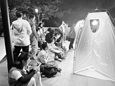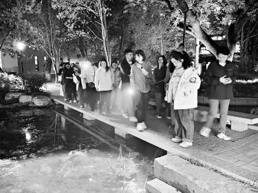 19時許,夜幕降臨。授課教師任利利帶著40余名學員利用各種夜觀設備,了解昆蟲的奧秘。課前10分鐘,任利利一邊招呼學員架設燈誘設備,一邊耐心地幫大家復習知識點:“此前的課上我們講到了,一部分昆蟲有趨光性,因為它們的視網膜上有一種色素能吸收紫外光,當感受到光亮時,就會朝著亮處飛去。這個廣場有梅園、林沼和櫻花步道,一旁的池塘里還種植著40多種水生植物,這樣的環境很適合大家夜觀昆蟲。”任利利打開一盞誘蟲燈,掛到燈誘帳篷的最頂端,一些小蟲子撲扇著翅膀,成團飛過來。學員們也聚集到帳篷四周,探著頭仔細觀察。