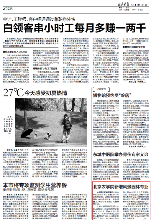 本報訊(記者張航)北京農學院日前公布了該校2014年的招生計劃。該校計劃在北京招收1060名本科生。專業設置上,該校今年新增了風景園林專業。