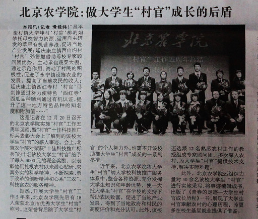 據悉,開展大學生“村官”工作5年來,北京農學院先后有18人榮獲北京市優秀大學生“村官”稱號。這榮譽背后除了大學生“村官”的個人努力外,也離不開該校助推大學生“村官”成長的一系列舉措。