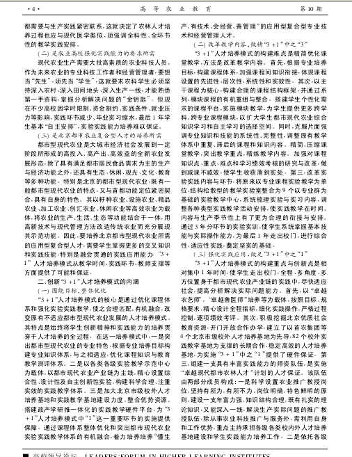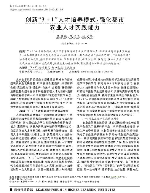 北京農學院積極適應首都建設世界城市和都市型現代農業發展需要,以培養綜合素質高、知識結構合理、實踐能力強,懂生產、有技術、會經營、善管理的應用型復合型專業技術和經營管理人才為目標,遵循高等教育教學和人才培養規律,轉變教育教學觀念,構建了與首都經濟社會發展相適應的“3 +1”人才培養模式,在提高學生分析解決都市現代農業生產、經營管理實際問題能力等方面取得了顯著成效。