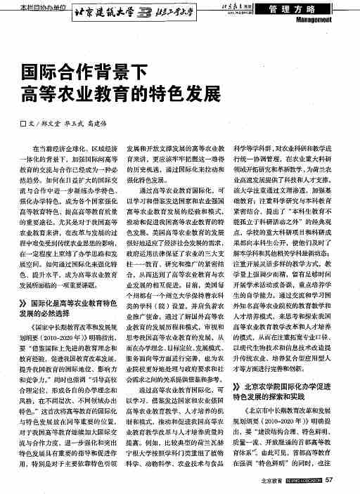 《北京市中長期教育改革和發展規劃綱要(2010—2020年)》明確提出,要“建設結構合理、特色鮮明、質量一流、開放融通的首都高等教育體系。”由此可見,首都高等教育在強調“特色鮮明”的同時,也注重強調高等教育的“開放融通”,充分體現了國際化和特色化之間的不可分割和有機融合。北京農學院作為一所北京市屬的以農為主、多科融合的都市型高等農業院校,始終堅持開門辦學、開放辦學,不斷加大國際交流與合作的力度,注重通過借鑒國外農林院校先進的辦學理念、發展機制以及教育教學和人才培養模式,來強化辦學特色,完善辦學模式,提升辦學水平。