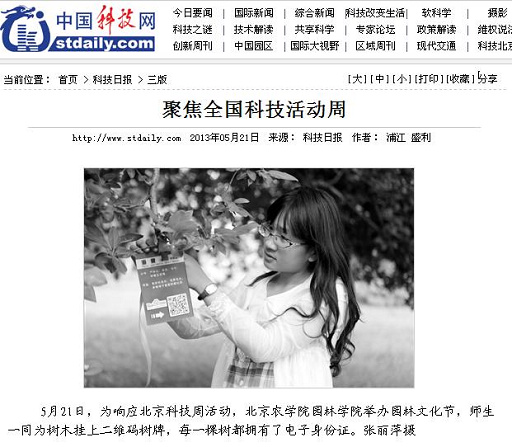 日,為響應北京科技周活動,北京農學院園林學院舉辦園林文化節,師生一同為樹木掛上二維碼樹牌,每一棵樹都擁有了電子身份證。張麗萍攝