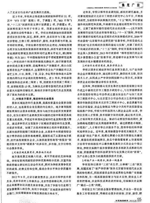 學(xué)校應(yīng)用基礎(chǔ)和應(yīng)用研究貼近行業(yè)和產(chǎn)業(yè)需求。兩年來,學(xué)校有1 人入選國家現(xiàn)代農(nóng)業(yè)產(chǎn)業(yè)技術(shù)體系,13人入選現(xiàn)代農(nóng)業(yè)產(chǎn)業(yè)技術(shù)體系北京市創(chuàng)新團(tuán)隊,其中1 人擔(dān)任創(chuàng)新團(tuán)隊首席專家,13 人擔(dān)任創(chuàng)新團(tuán)隊崗位專家。北京市已建設(shè)的8 個現(xiàn)代農(nóng)業(yè)產(chǎn)業(yè)技術(shù)體系創(chuàng)新團(tuán)隊中有5 個團(tuán)隊中有北京農(nóng)學(xué)院的專家,這標(biāo)志著學(xué)校的應(yīng)用基礎(chǔ)和應(yīng)用研究密切融和了北京現(xiàn)代農(nóng)業(yè)發(fā)展的需求,并已融入了北京市行業(yè)和產(chǎn)業(yè)發(fā)展的主戰(zhàn)場。