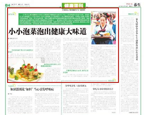 12月5日,聯(lián)合國教科文組織正式將韓國“腌制越冬泡菜文化”列入人類非物質(zhì)文化遺產(chǎn)名錄。調(diào)查顯示,95%的韓國人一天至少會吃一次以上的泡菜,64%的韓國人一日三餐都會吃泡菜。對韓國人來講,泡菜有“媽媽的味道”,更是一種文化的傳承。其實(shí),泡菜所具有的獨(dú)特保健功能才是其風(fēng)靡全球的真正原因。美國《健康》雜志將泡菜評選為世界上最健康的5種食物之一。斯坦福大學(xué)研究小組認(rèn)為,泡菜具有預(yù)防疾病和提高免疫功能的效用,發(fā)酵后的泡菜還具有抗菌功能。泡菜可降低膽固醇、預(yù)防癌癥、美化皮膚、增進(jìn)消化,而且還可以預(yù)防傳染病。研究發(fā)現(xiàn),泡菜中的纖維質(zhì)對預(yù)防便秘和大腸癌也有良好功效。