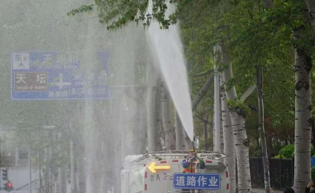 除了修剪樹枝,針對即將到來的柏樹花粉高峰期,全市還將動用霧炮車進行灑水噴淋、地面濕化,加速花粉沉降,降低局部濃度。